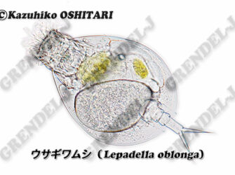 この図鑑では便宜上ミジンコ科としているが異なるもの。ミジンコ属は同じ枝角上目でも異脚下目 (Anomopoda)であるのに対して鉤脚下目(Onychopoda)ウミオオメミジンコ科(Podonidae)エボシミジンコ属(Evadne)に分類される。