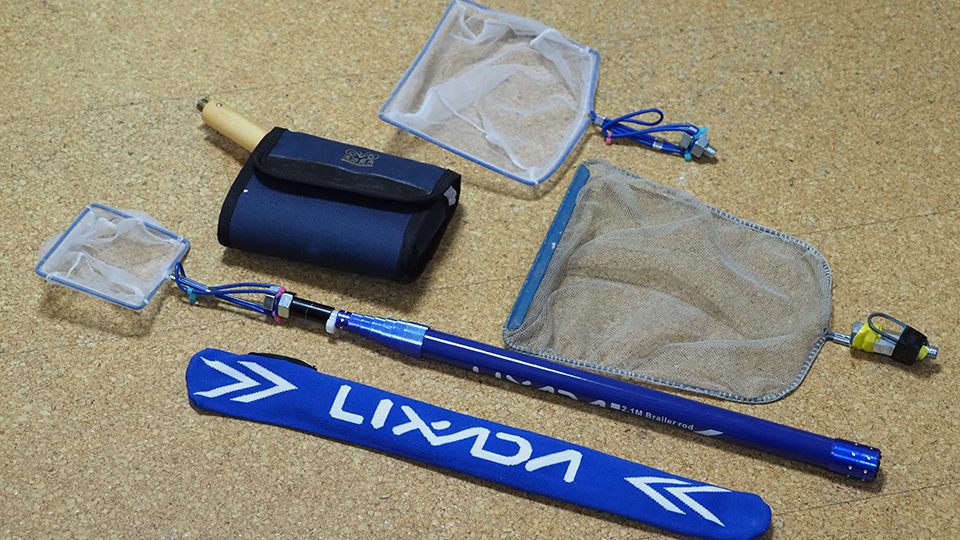 鈴木さんが見つけてくれた竿は釣りのたも網として使うもの。軽量ですが伸ばせば2メートルで、先端がM1/2インチのメスになっているのがポイントです。