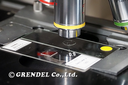 このステージについているクランプはスライドガラスを2枚固定できるので奥に対物ミクロメーターを入れておき大きさを記録したい時には同じ条件でこれを撮影します。オプトバールモジュールを使っているからこそ必要な作業です。